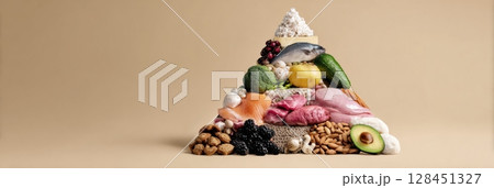 Pyramid structure displays a variety of natural ingredients beneficial for pet health, emphasizing balanced nutrition and wholesome feeding options