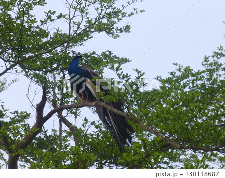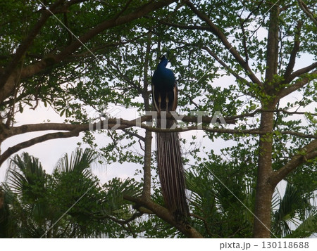 台灣花蓮-04.10.2025:樹上的公共印度孔雀,位於壽豐鎮理想的陸運飯店
