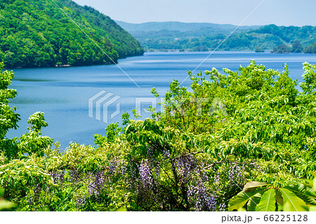 萬代Azuma Lakeline初夏的風景,紫藤花沿著福島縣豬苗代町秋元湖的岸邊盛開