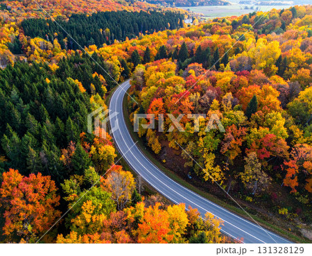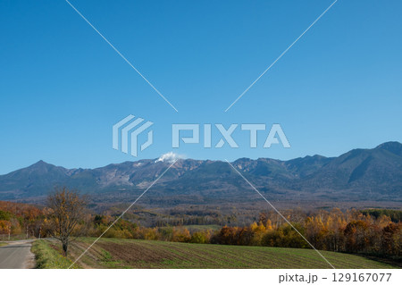 [秋天素材]從八嶽大橋看到的紅葉季節的八岳和藍天[山梨縣]