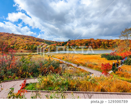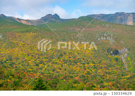 從東山脈的一勢峽山眺望五色沼的紅葉