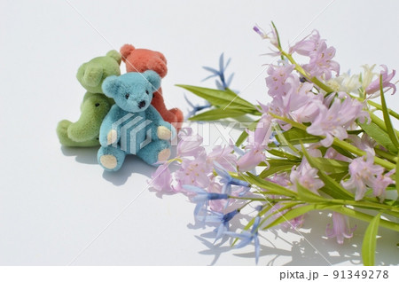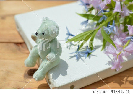 一束淡色的席勒和amsonia elliptica和一隻泰迪熊