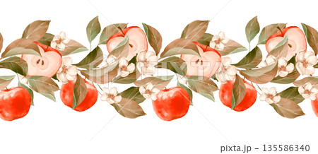 Hand drawn illustration of a seamless horizontal border featuring deep red apples, pink blossoms, and golden autumn leaves.