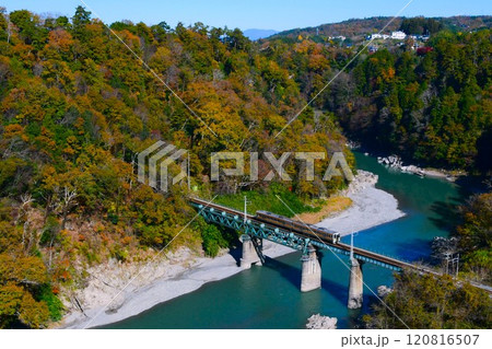 秋季經過天龍峽的飯田線213系5000系天龍峽大橋空散步