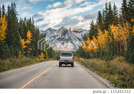 Pickup truck driving on highway in autumn forest and rocky mountains at Banff national park, Canada