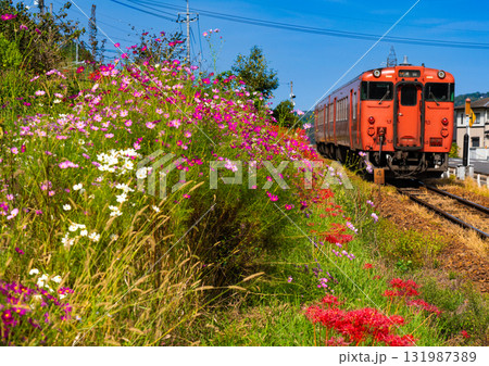 秋花爛漫的岡山縣岡山市北區,津山線「KIHA 120號」普通列車開往岡山2號站方向