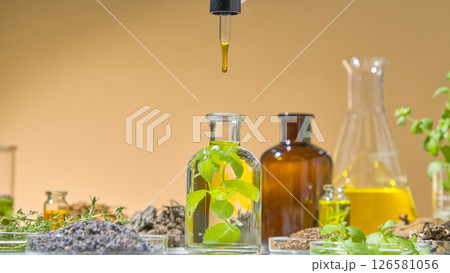 Filling small glass vials with herbal oil blend, arranged with natural ingredients in an organic skincare lab. Herbal leaves such as tea tree, rosemary... with yellow essential oil