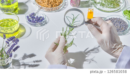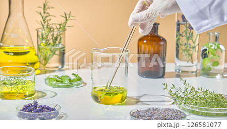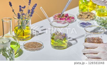 Researcher organizing colorful herbs and extracts for laboratory experiment in organic skincare development. Herbal on lab glassware displayed on white table.