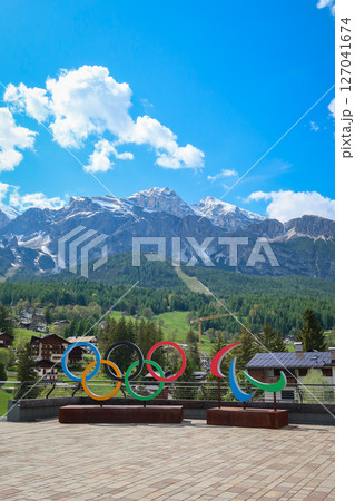 Cortina d'Ampezzo 2026 Olympic Rings with Scenic Dolomites View in Cortina d'Ampezzo, Italy. May 14, 2025