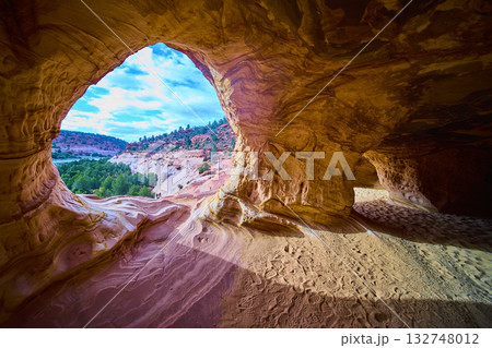 Sandstone Cave Entrance Overlooking Desert Valley and Red Cliffs in Utah