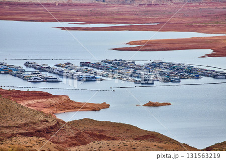 Lake Powell Marina and Red Rock Mesas with Houseboats Panoramic Overlook