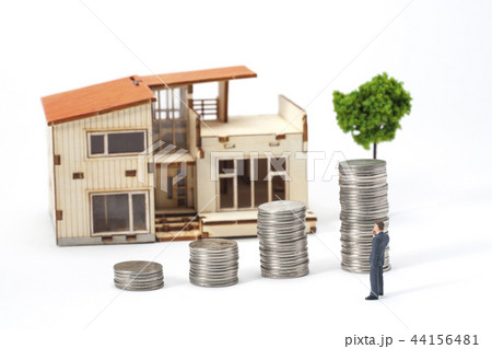 房地產概念:與房子和硬幣和放大鏡的微型商人