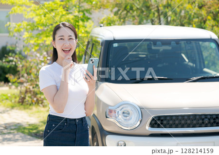開車來海邊休閒的女人;在海邊開車旅行的女人