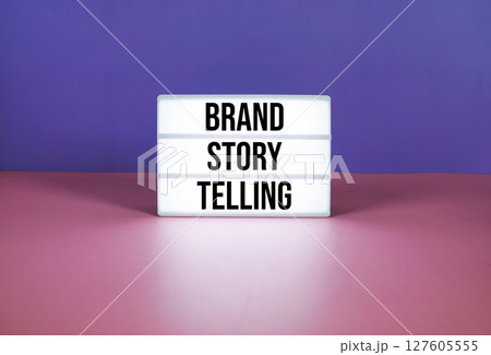Brand Story Telling text on LED lightbox on purple and pink geometric background