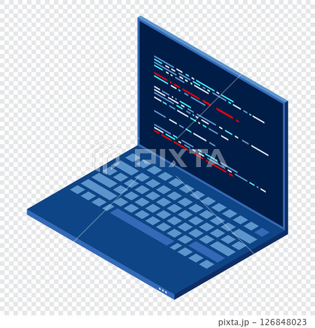 Isometric Laptop. 3d isometric laptop computer. Abstract programming language and program code on a laptop screen. Isometric technology