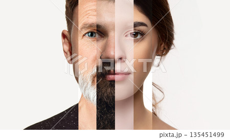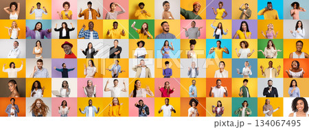 A colorful collection showcases diverse individuals smiling and expressing joy against bright backgrounds. This vibrant portrait captures a celebration of diverse lifestyles and unity.