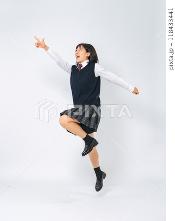 女學生指著天空向球門跳躍的全身照片