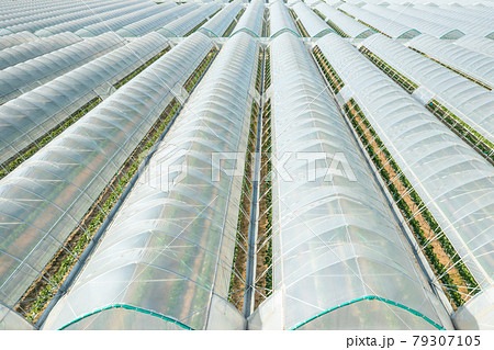 Greenhouses in rows covered with transparent film for growing vegetables.