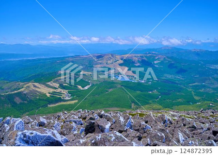 從山頂西側眺望長野縣蓼科山的春天景色(白樺湖、車山、屋古峰等)