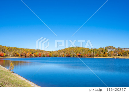 長野縣北作郡蓼科町金星線白樺高原夕日之丘公園的落葉松等秋葉景觀