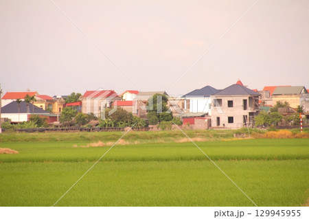 Rice fields in Vietnam. There are green rice fields in the field. Farmers work on them. In the background are villages and country roads