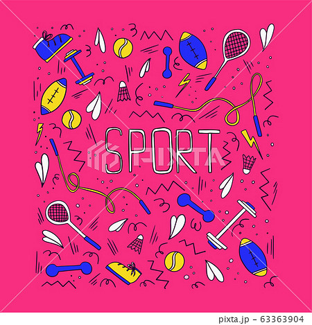 Sports illustration with different sport symbols. Vector active lifestyle illustration in doodle style with typography.