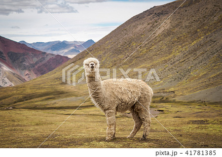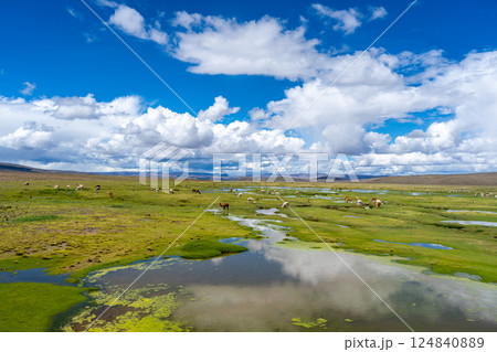 Alpacas and llamas grazing near wetlands in the highlands of Peru