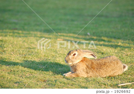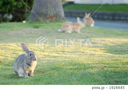 [新年素材] 廣島縣竹原市奧之島產的兔子,米色躺在草坪上,棕色坐著