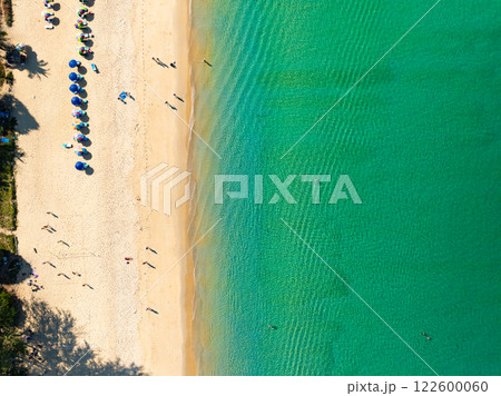 Amazing Top view sand beach landscape background,Summer sea waves crashing on sandy shore seascape background,Many travel people relax on beach at Phuket Thailand