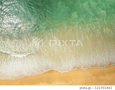 Summer seascape beautiful waves,Tropical sea water in sunny day, Top view from drone camera,Amazing ocean colorful nature background, Beautiful bright sea waves splashing on beach sand