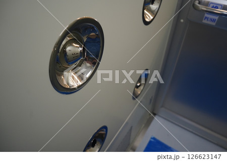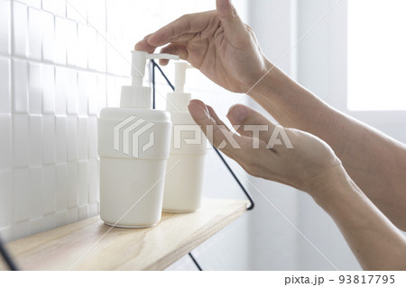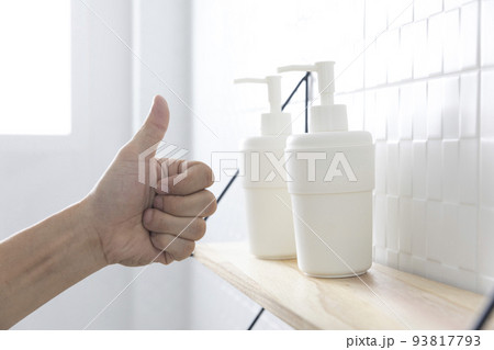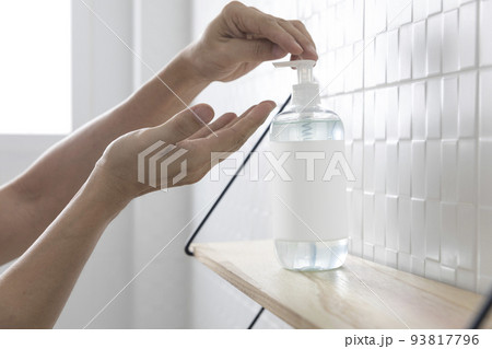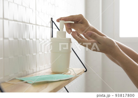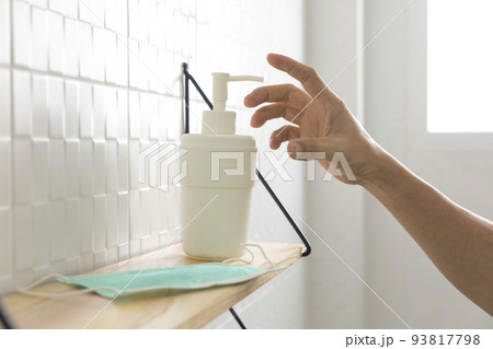 Hand sanitizer and face masks on a shelf with human hand. Coronavirus COVID-19 hand hygiene prevention.th care concept