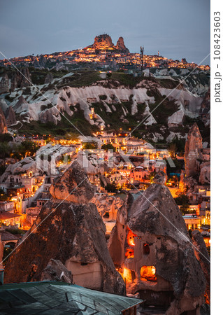 從土耳其旅遊勝地卡帕多西亞市中心的觀景台上可以看到奇異的岩層和發出橙色光芒的岩石住宅的美麗夜景。