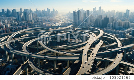 Aerial view of highway junctions, Bridge roads shape number 8 or infinity sign in structure.