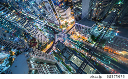 Aerial top view of highway and overpass in city at night, Aerial view of the traffic and intersection road at the city, Highway road junctions at night.