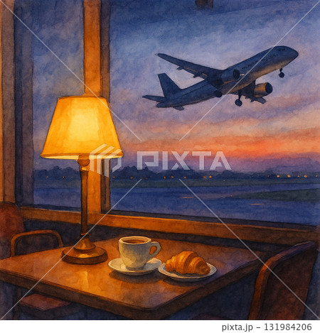 機場咖啡廳的黃昏時光 飛機起飛與溫暖燈光的水彩畫