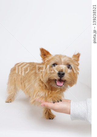 一隻諾里奇梗犬在白色背景下表演小把戲,臉上帶著溫柔的表情。