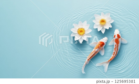 Peaceful Lotus Flowers Floating on a Tranquil Pond with Koi Fish