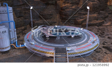 Futuristic Satellite Dish Under Golden Morning Sky with Light Flare and Cosmic Landscape