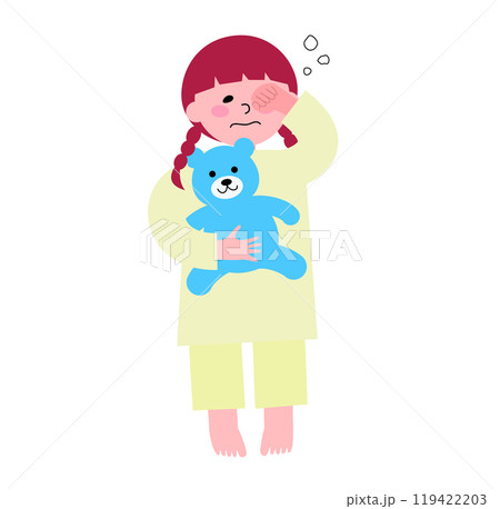 一個穿著睡衣、抱著一隻泰迪熊揉著睡眼的年輕女孩的全身插圖
