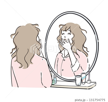 一位穿著睡衣的女士照鏡子時發現自己的皮膚很粗糙