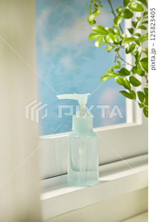 A blue cosmetic bottle with a pump stands on a white window shelf, next to leafy green plants. Inside the bottle is a clear liquid essence. Outside the glass door is a view of the clear blue sky.