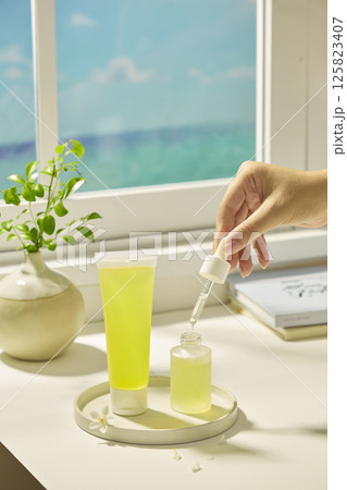 A tube filled with yellow liquid extracted from lemon. Hand holding the pump of a dropper cosmetic bottle, drops of essence are flowing into the glass bottle. Scene of a table next to the window.