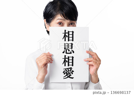 一位身穿白襯衫的老婦人,手裡拿著一張寫著「互相愛慕」的紙條,面帶微笑,一手撫摸著臉頰。