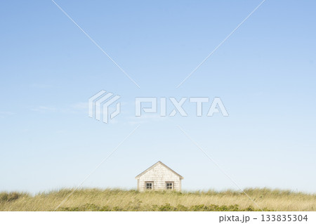 Blue sky above small storage beach shed with grass in foreground