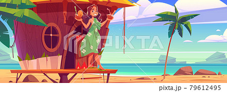 Woman with cocktails in tiki hut on hawaii beach