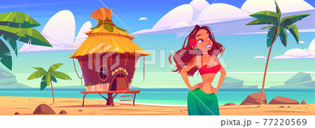 Young woman on sea beach with hut or bungalow