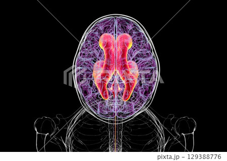 Thalamus of human brain, 3D illustration showing the paired deep gray matter structures that relay sensory and motor signals to the cerebral cortex.