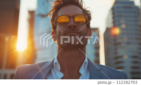 AI-generated content. A happy wealthy rich successful Indian businessman stands in a big city on sunset thinking of a prosperous future and dreaming of new investment opportunities.