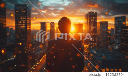AI-generated content. A rich, successful, wealthy Indian businessman stands in a big city skyline on a sunset contemplating the future, dreaming of new investment opportunities.