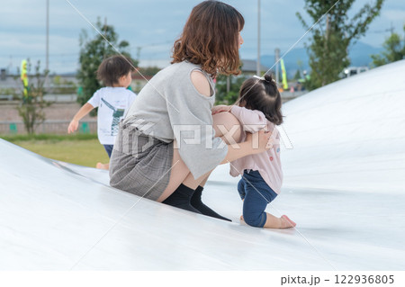 [母親和嬰兒站在巨大的遊樂場設備上]